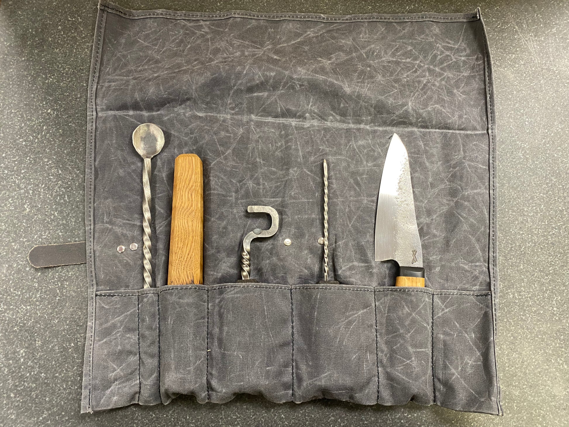Hand-made entirely in-house These tools are built for both the avid home mixologist and the pro bartender. All of the tools are forged from stainless steel, 316 for the tools, and AEB-L for the knife. This is so the kit is low maintenance, and can handle being in damp conditions. I decided to use white oak for the handles and the muddler because it is what whisky and wine barrels have been made from for generations. White oak is extremely durable and has a great feel in the hand. The muddler has been gently charred to seal the grain, and the handles on the ice pick and bottle opener have been as well. The bar knife is a very task-oriented design, with plenty of bellies to slice through all types of citrus, and a delicate tip to carve all types of garnishes. The AEB-L blade has been heat-treated to approximately 62 Rockwell, and the edge has been ground to a nice and sturdy convex. The brushed finish helps food to release and stays good-looking for a long time. The Tool Roll was hand sewn from high-quality waxed canvas, my personal favorite material for utilitarian purposes. This material repels water and develops a great look over time.